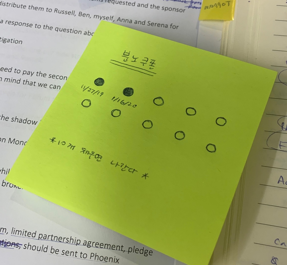 어떻게 하면 합리적인 결정을 할 지 고민을 하다가 나의 감정을 수치화(quantify) 하는 게 낫겠다는 생각이 들었다. 예전 한국의 카페에서 종종 모았던 커피쿠폰을 떠올렸다. 내가 여기서 10번 참을 수 없는 일이 생기면 그 때는 뒤 돌아보지 않고 바로 나가기로 결심했다. 그렇게 포스트 잇에 분노 쿠폰을 만들어 도저히 참을 수 없는 분노가 밀려올 때 한 칸씩 칠하고 날짜를 적기로 했다.