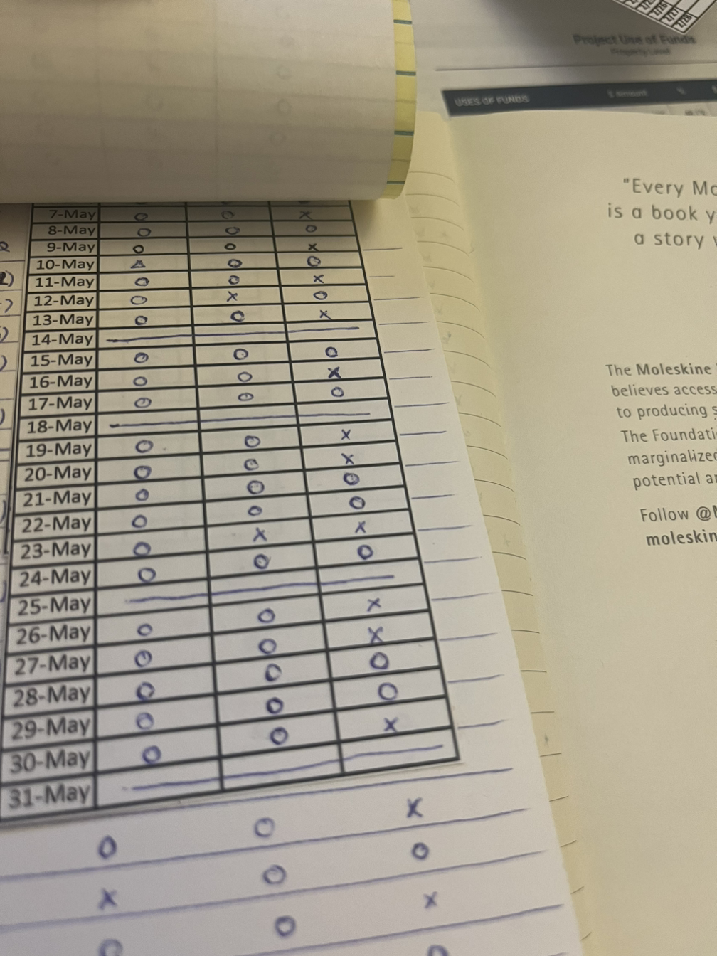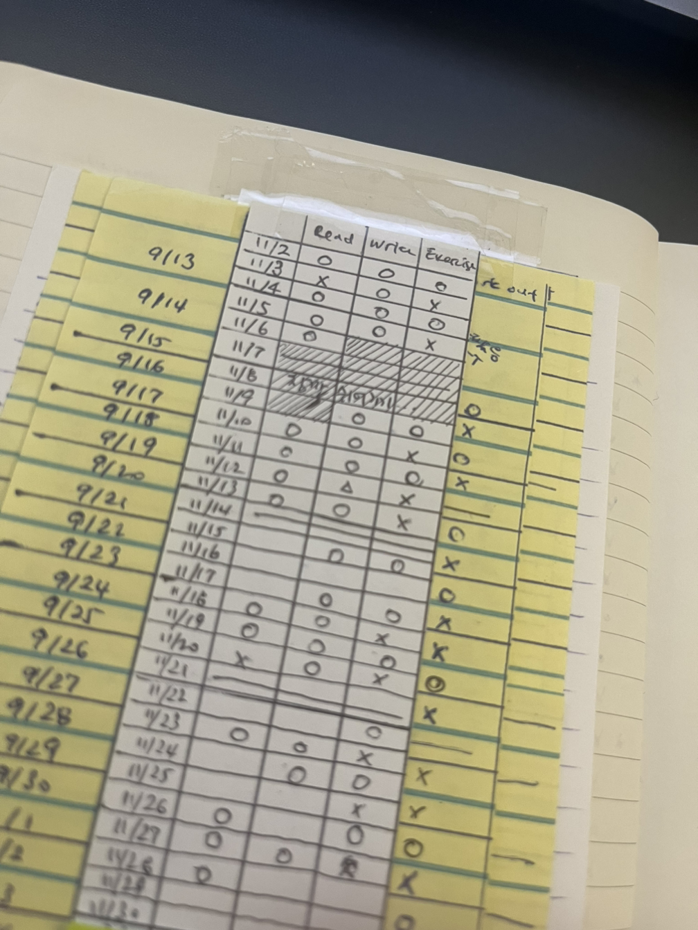 매일 동그라미를 다 그리지도 않는다. 못한 것이 있으면 엑스(x)를 그려 넣는다. 가끔 애매하게 한 날에는 용감하게 세모(△)도 도입한다! 그렇게 6일을 이어가다가 일주일 중 하루는 줄을 그어버리고 아예 쉬어간다. 힘든 일이 있거나 잠깐 쉬어가는 시간이 필요한 시기에는 며칠을 과감히 제끼기도 한다. 나름의 룰이 있지만 그렇다고 아주 타이트하지도 않은 나만의 독특한 계획.