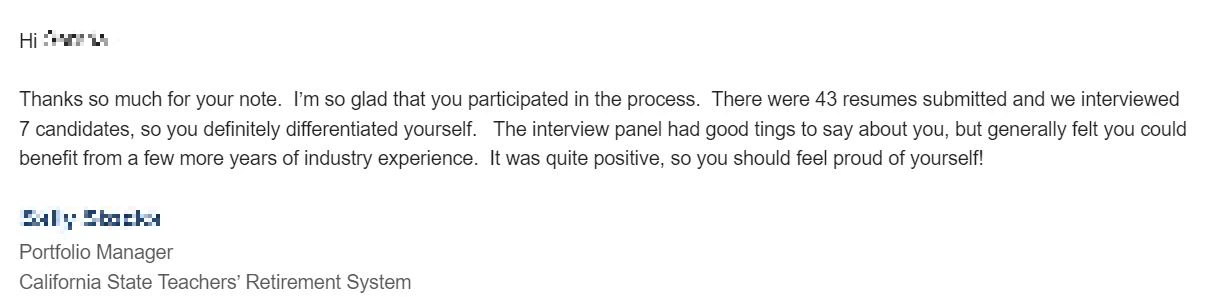그래서 나도 공기관 일자리를 기웃거리던 중에, 참 감사하게도 캘리포니아 사학연금(California State Teachers' Retirement)의 부동산 포트폴리오 매니저 자리의 면접기회를 받을 수 있게 되었다! 미국 내의 연기금 중에서 캘리포니아 사학연금은 세번째로 운용규모가 큰 곳이다.